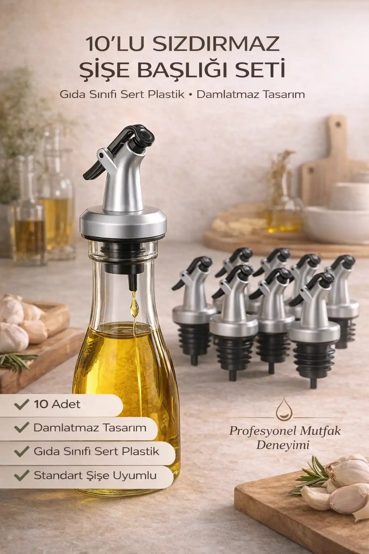 • Bu 10’lu yağdanlık şişe başlığı seti; damlatmaz yağlık ucu, sızdırmaz şişe tapası, yağlık sirkelik aparatı, sosluk şişe başlığı, zeytinyağı dökme aparatı, sirke şişesi kapağı, nar ekşisi dökme ucu, kontrollü sıvı akış aparatı, profesyonel mutfak yağdanlık başlığı, standart şişe uyumlu yağ şişesi tıpası, akıllı döküm başlığı ve mutfak düzenleyici aksesuar arayan kullanıcılar için pratik bir çözümdür. Ev mutfak ekipmanları, yağlık aparatları ve servis şişesi aksesuarları kategorisinde değerlendirilebilir.