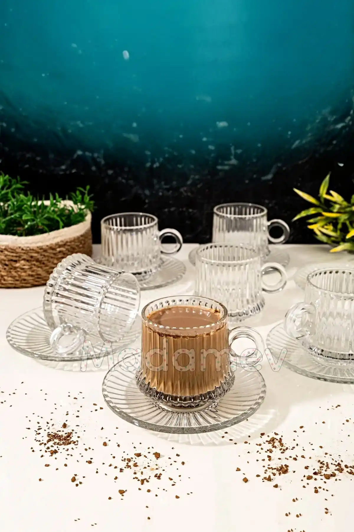 Madamev Doğrulanmış Marka 12 Parça Cam Kahve Fincan Seti Origami Çizgili Desen Nescafe Fincanı Cam Tabaklı Çay Takımı 125cc
