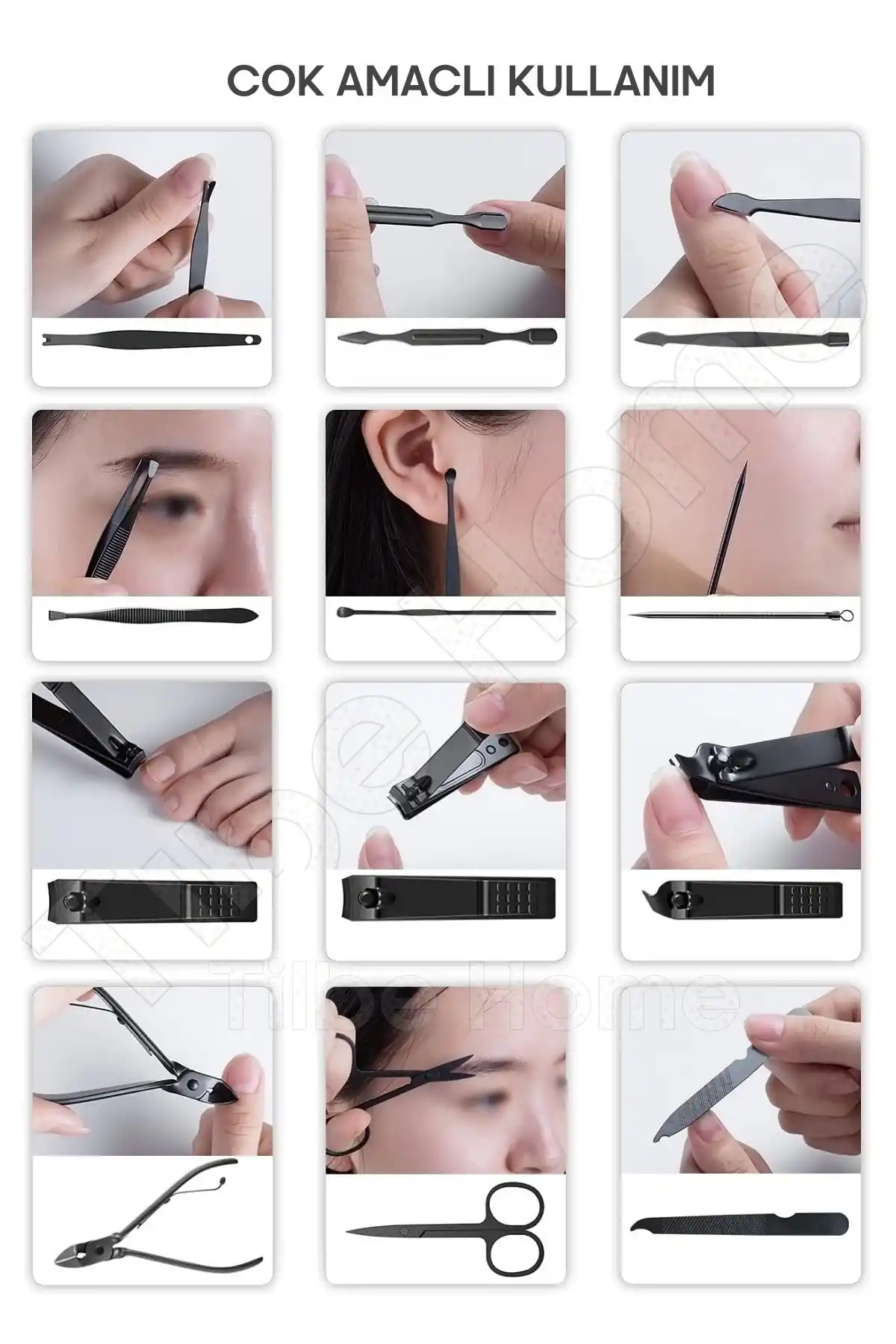 Tilbe Home Doğrulanmış Marka 12 Parça Çantalı Manikür Pedikür Seti El Ayak Tırnak Bakım Seti Cımbız Makas Siyah Nokta Temizleme