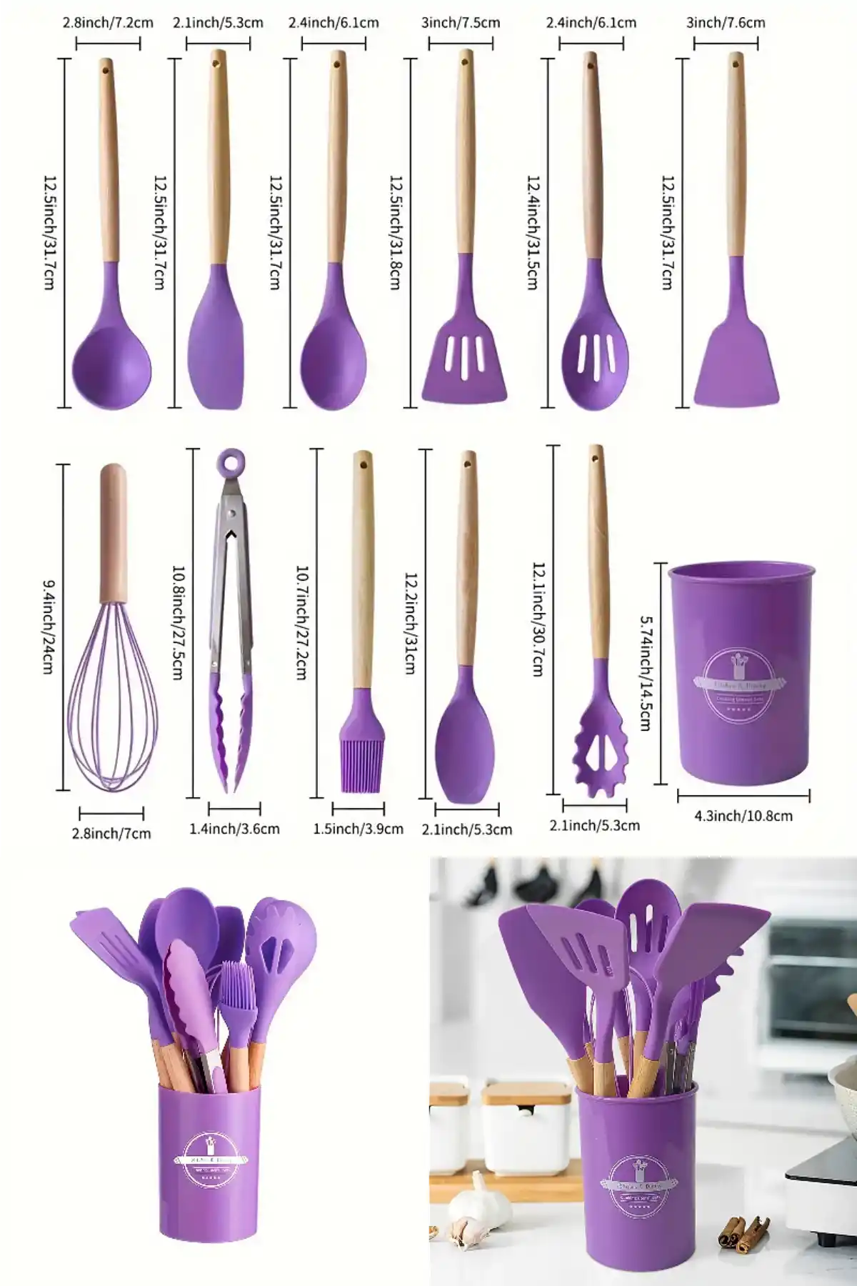 Tilbe Home Doğrulanmış Marka 12Parça Silikon Kepçe Kevgir Spatula Kaşık Fırça Çırpıcı Servis Maşa Seti Bambu Mor Mutfak Takımı