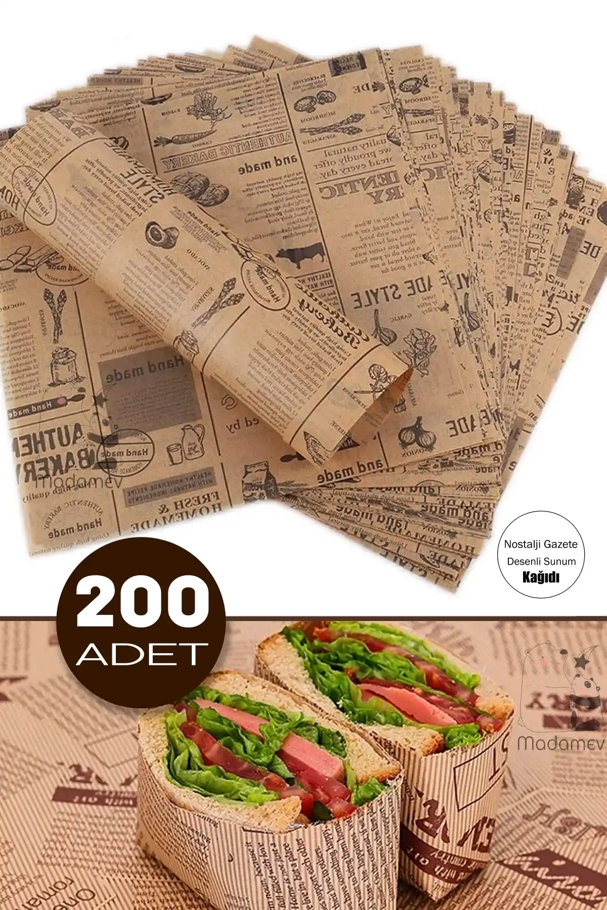 • Madamev 200 Adet Breakfast Desenli Yağlı Kağıt Vintage Gazete Desenli Aparatif Kağıdı Mutfak Servis Sunum Kağıdı