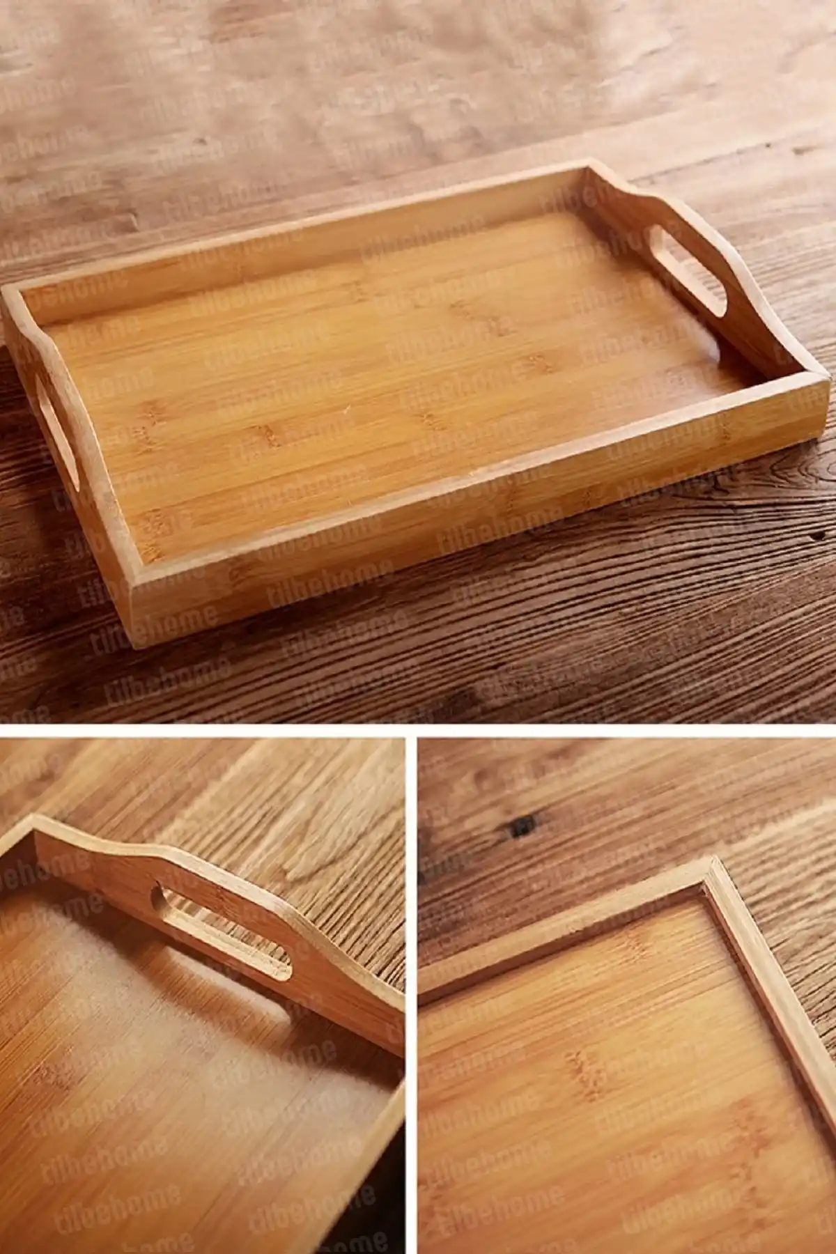 Tilbe Home Doğrulanmış Marka 2'li Bambu Çay Tepsisi Kulplu Dikdörtgen Büyük + Orta Boy Kahve Çay Servis Sunum Doğal Bambu Tepsi