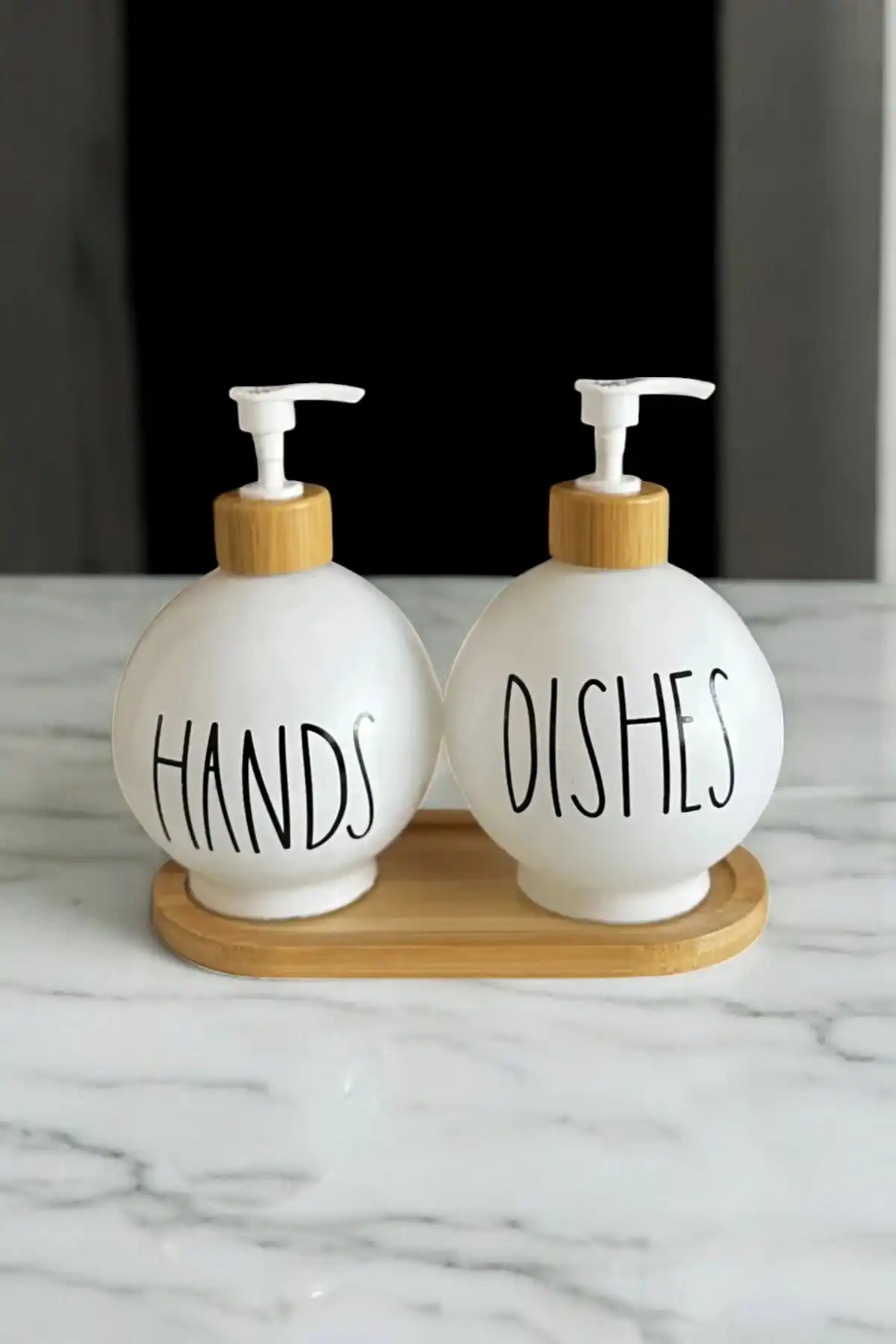 • Hands Dishes 2’li Hands Dishes Siyah Dekoratif Mutfak Banyo Sıvı Cam Sabunluk Seti 550ml Bambu Stantlı Set