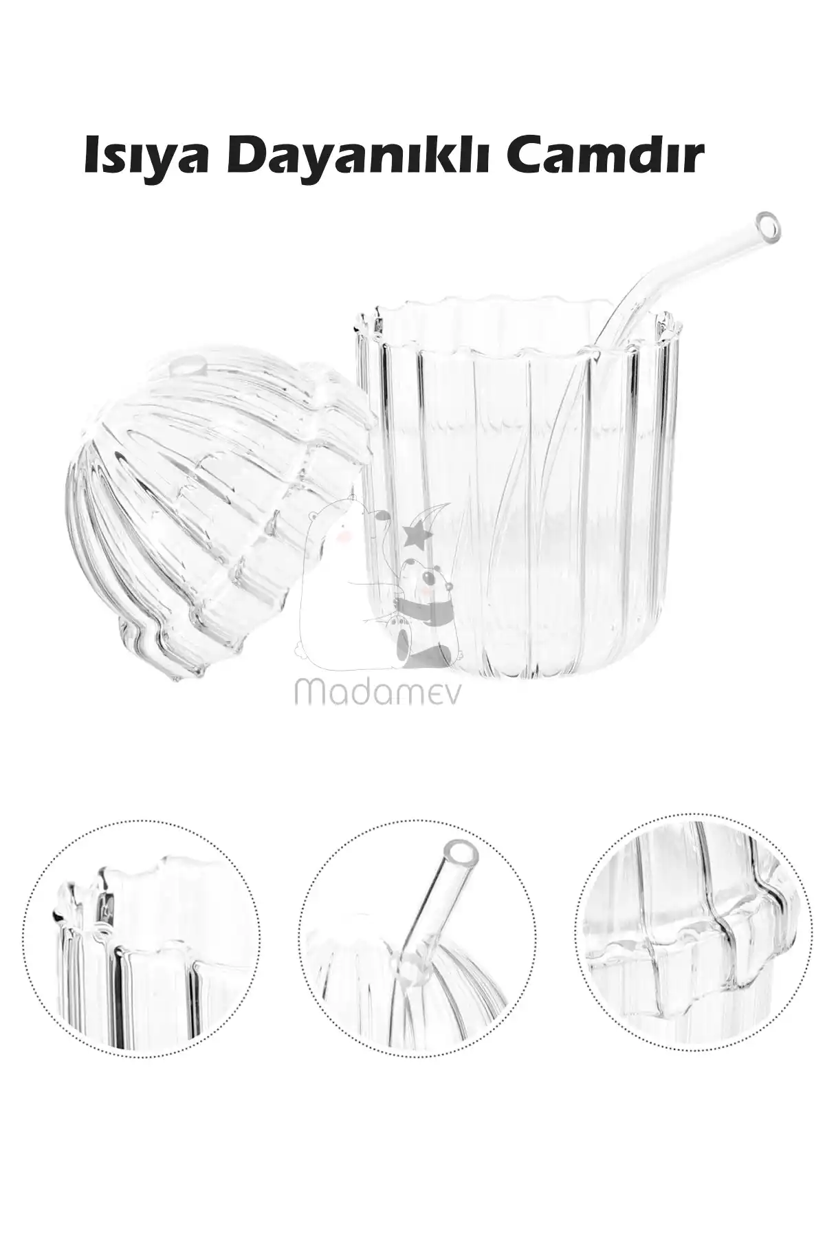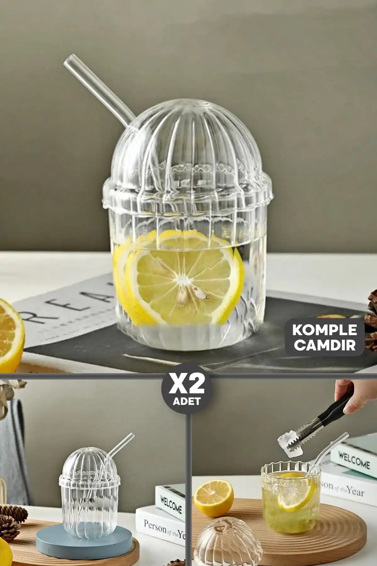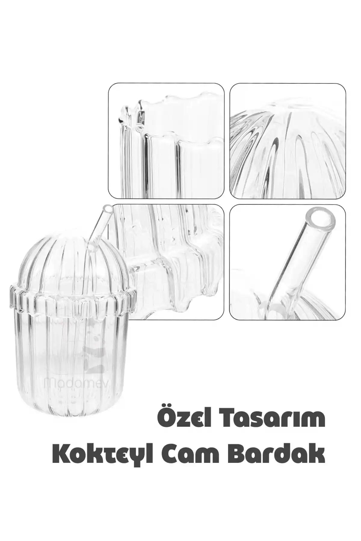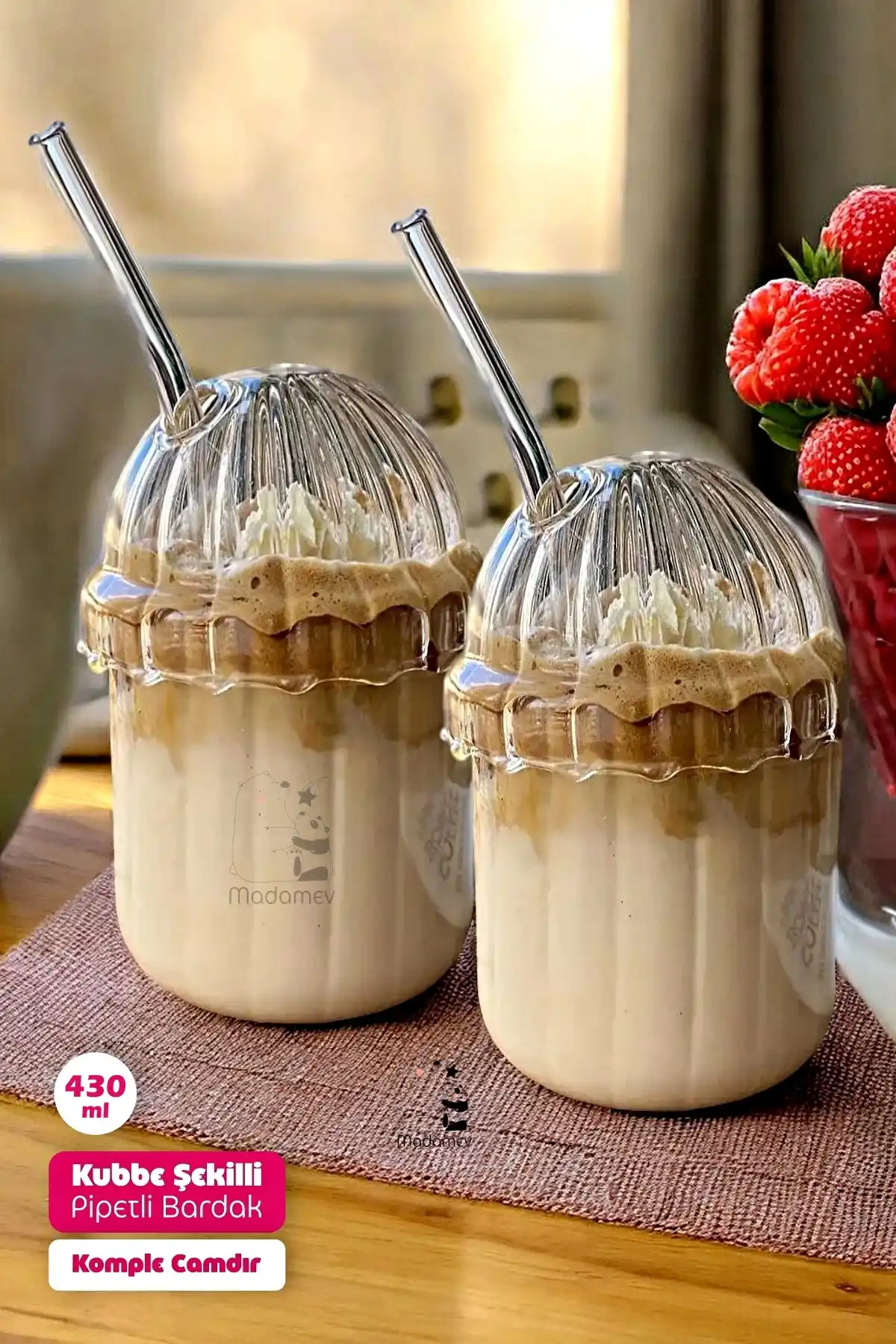 Madamev Doğrulanmış Marka 2'li Kübbe Kapaklı Pipetli Bardak Isıya Dayanıklı EggGlass İskandinav Kahve Sunum Bardağı 430ml Set