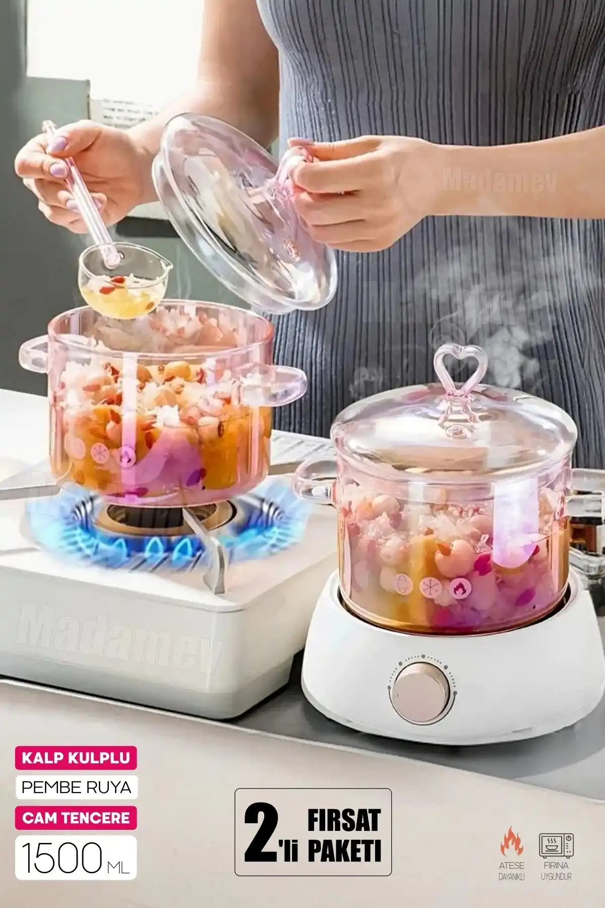 • Madamev 2 Adet Borosilikat Cam Tencere 1500ml Kalp Figürlü Isıya Dayanıklı Pembe Pink Kapaklı Tencere Seti