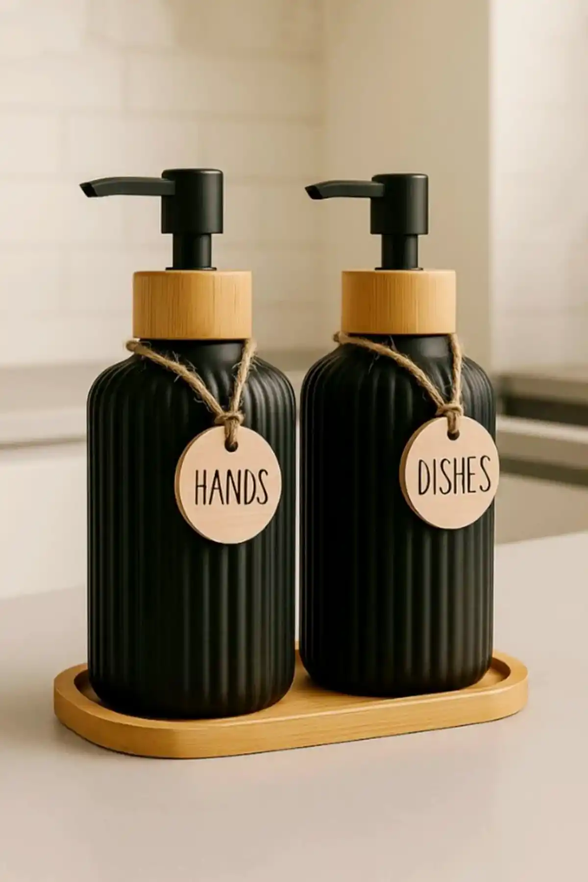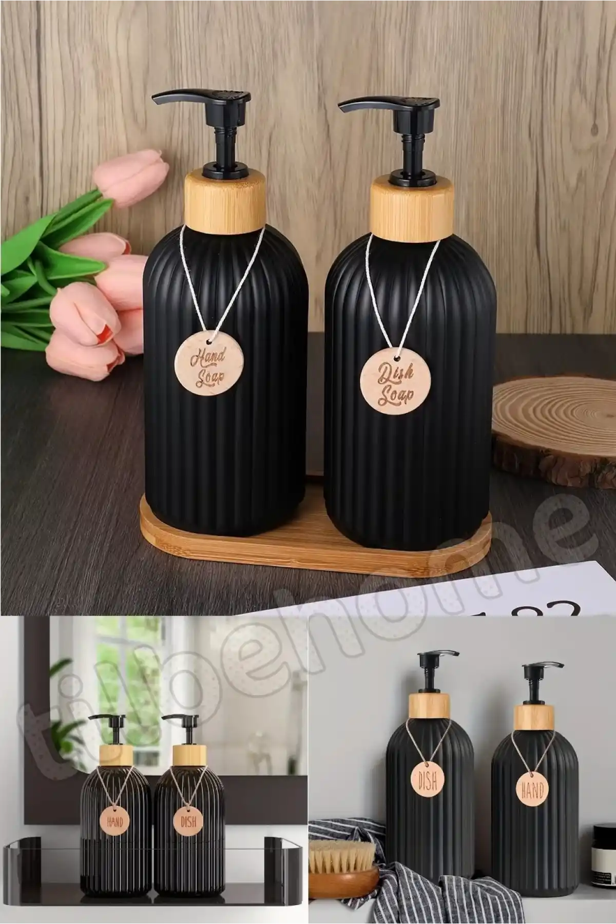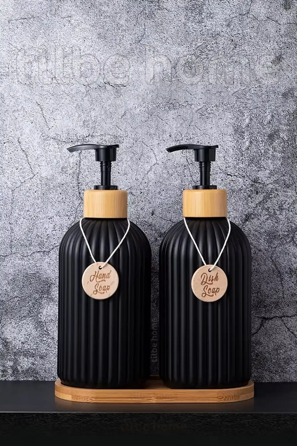 Hands Dishes Doğrulanmış Marka 2’li Siyah Retro Dekoratif Mutfak Banyo Sıvı Cam Sabunluk Seti 500ml Bambu Stantlı Sabunluk Seti