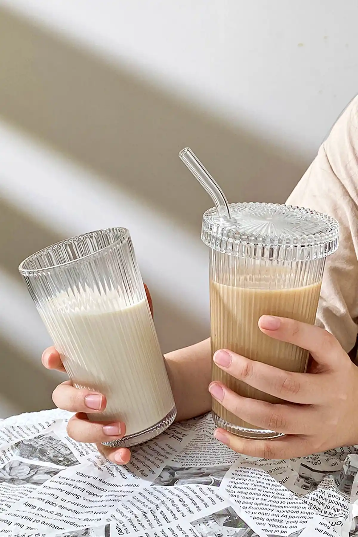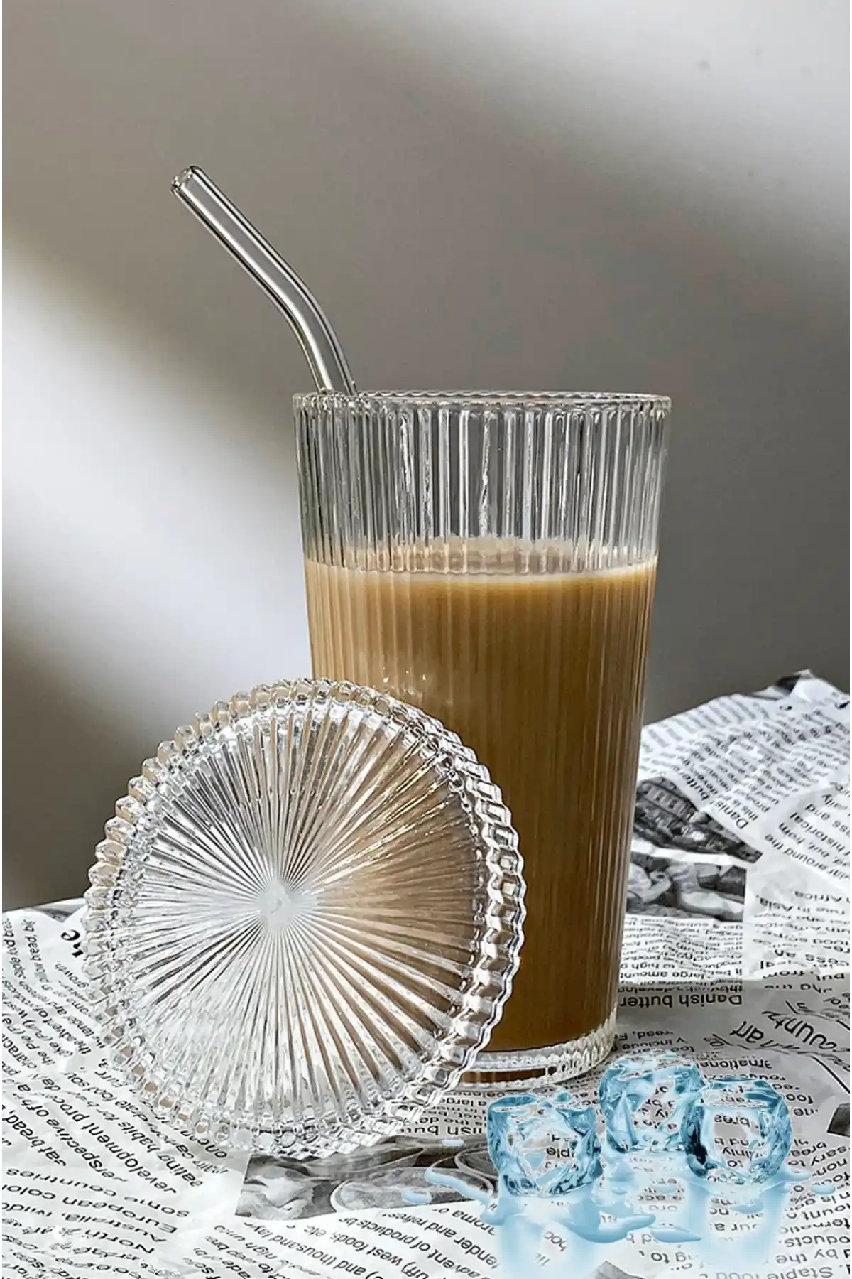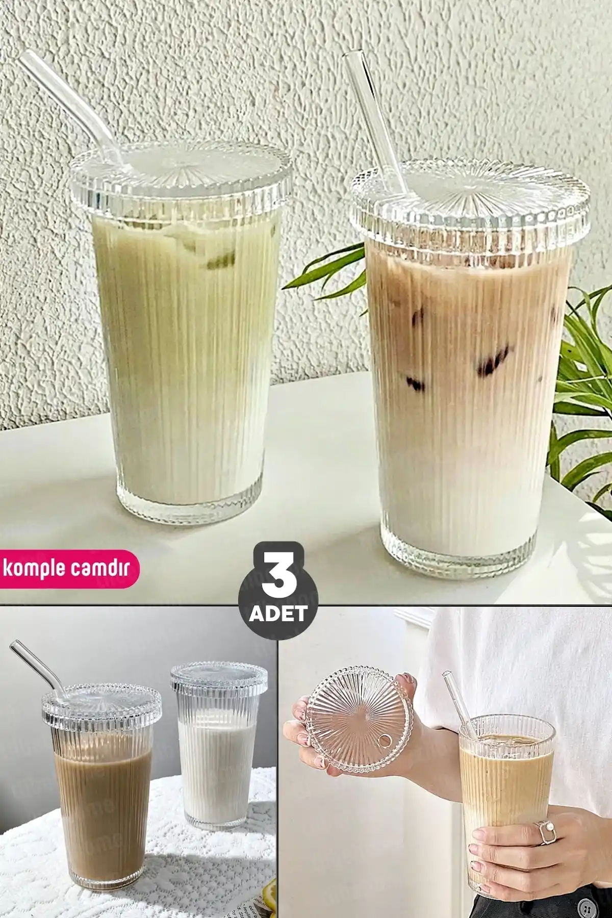 Tilbe Home Doğrulanmış Marka 3 Adet Kapaklı Pipetli Cam Bardak Soğuk Sıcak Kahve Meşrubat Çizgili Sunum Origami Stil Bardağı