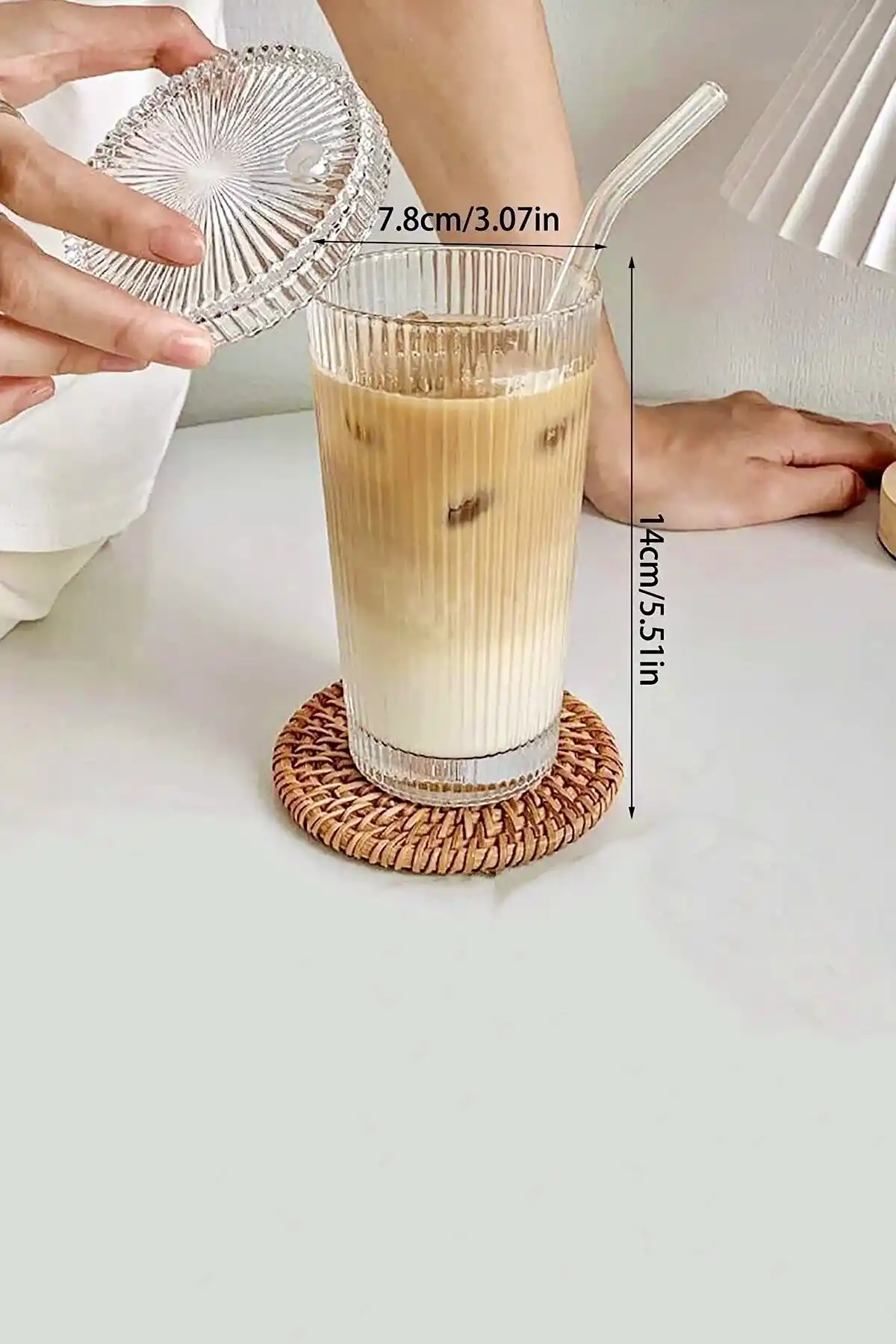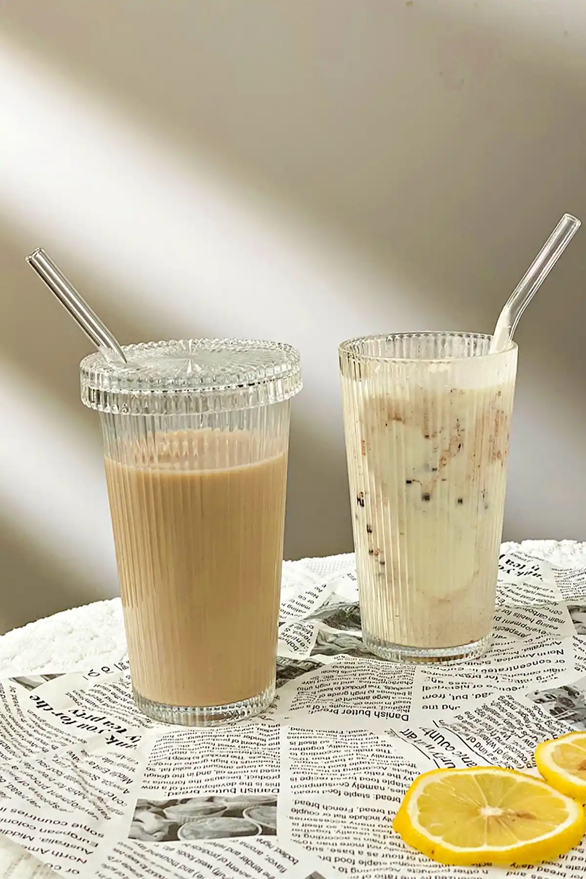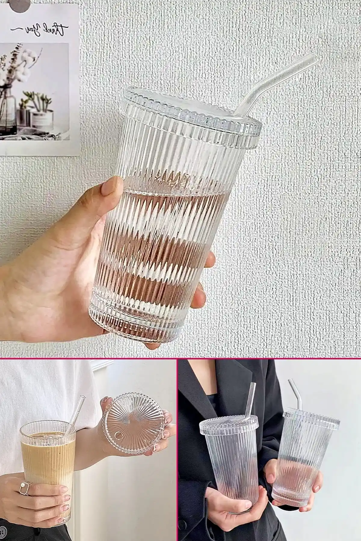 Tilbe Home Doğrulanmış Marka 3 Adet Kapaklı Pipetli Cam Bardak Soğuk Sıcak Kahve Meşrubat Çizgili Sunum Origami Stil Bardağı