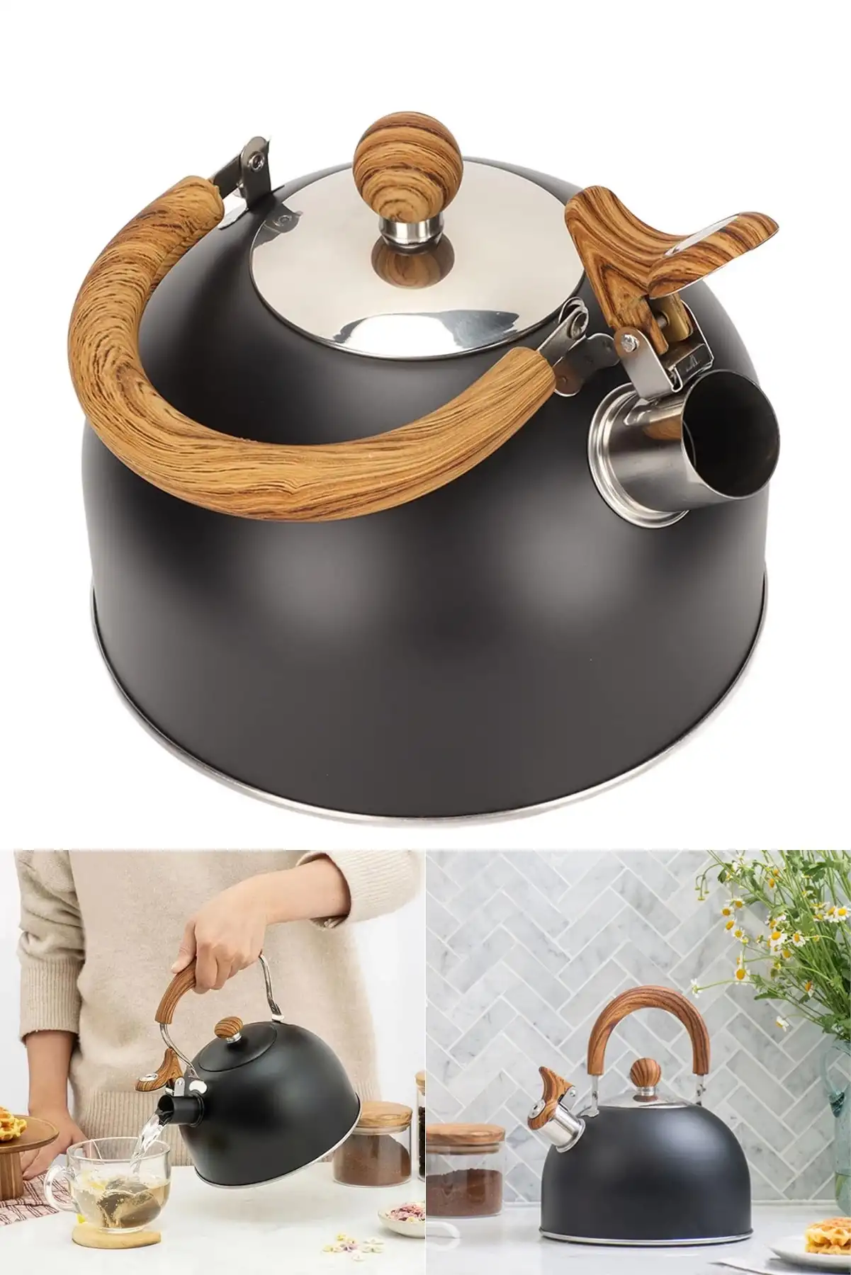 • Tilbe Home 3 Litre Düdüklü Çaydanlık Ahşap Detaylı İskandinav Tarz Su Isıtıcı Islık Çalan Çaydanlık Kettle Demlik Çay Potu İndüksiyon Ocak & Gaz Soba Uyumlu Paslanmaz Çelik Çaydanlık