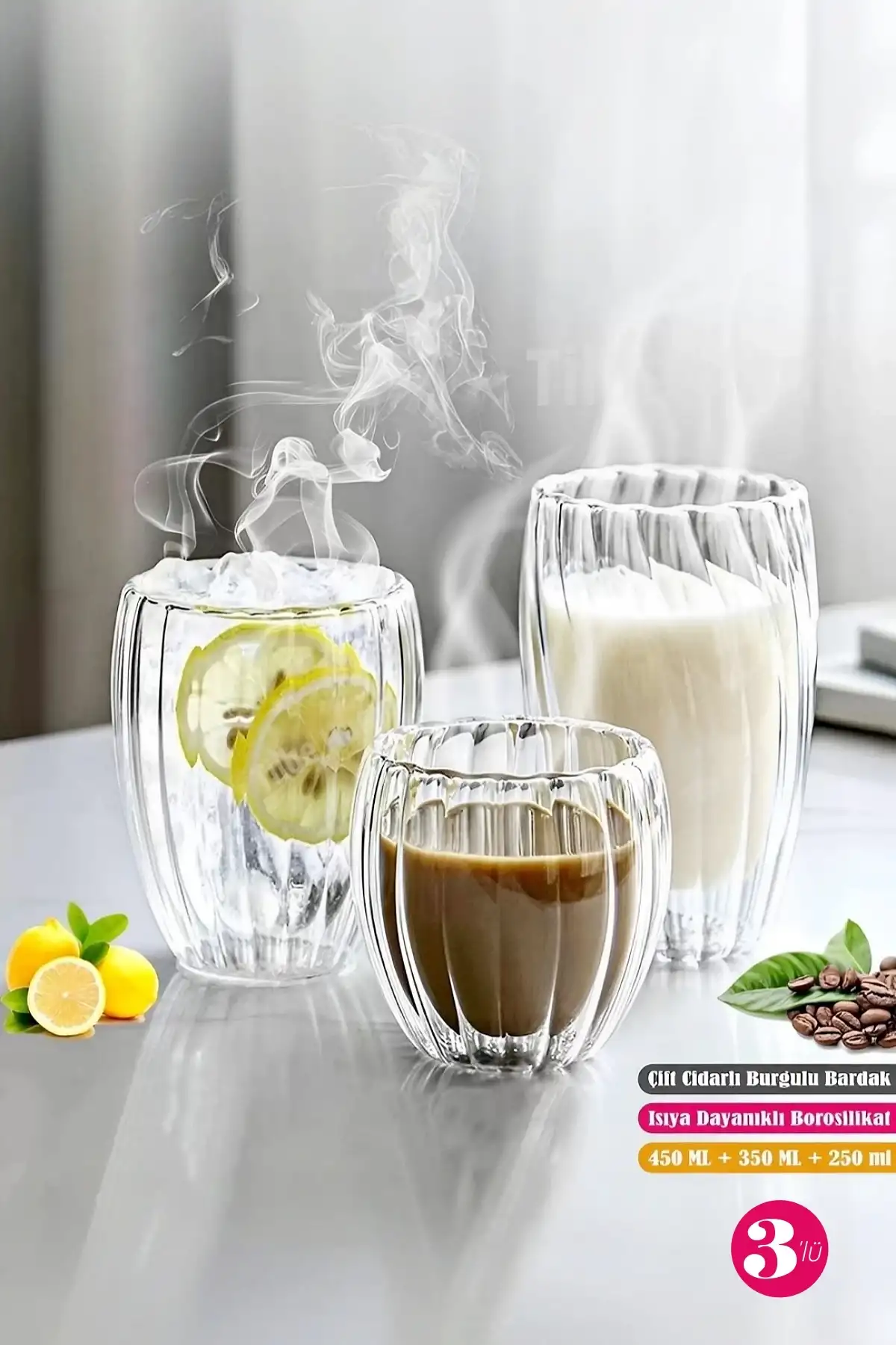 • Tilbe Home 3’lü Çift Cidarlı Burgulu Kristal Cam Bardak Seti – Sıcak & Soğuk Çay Kahve Süt Kupası Retro Seti
