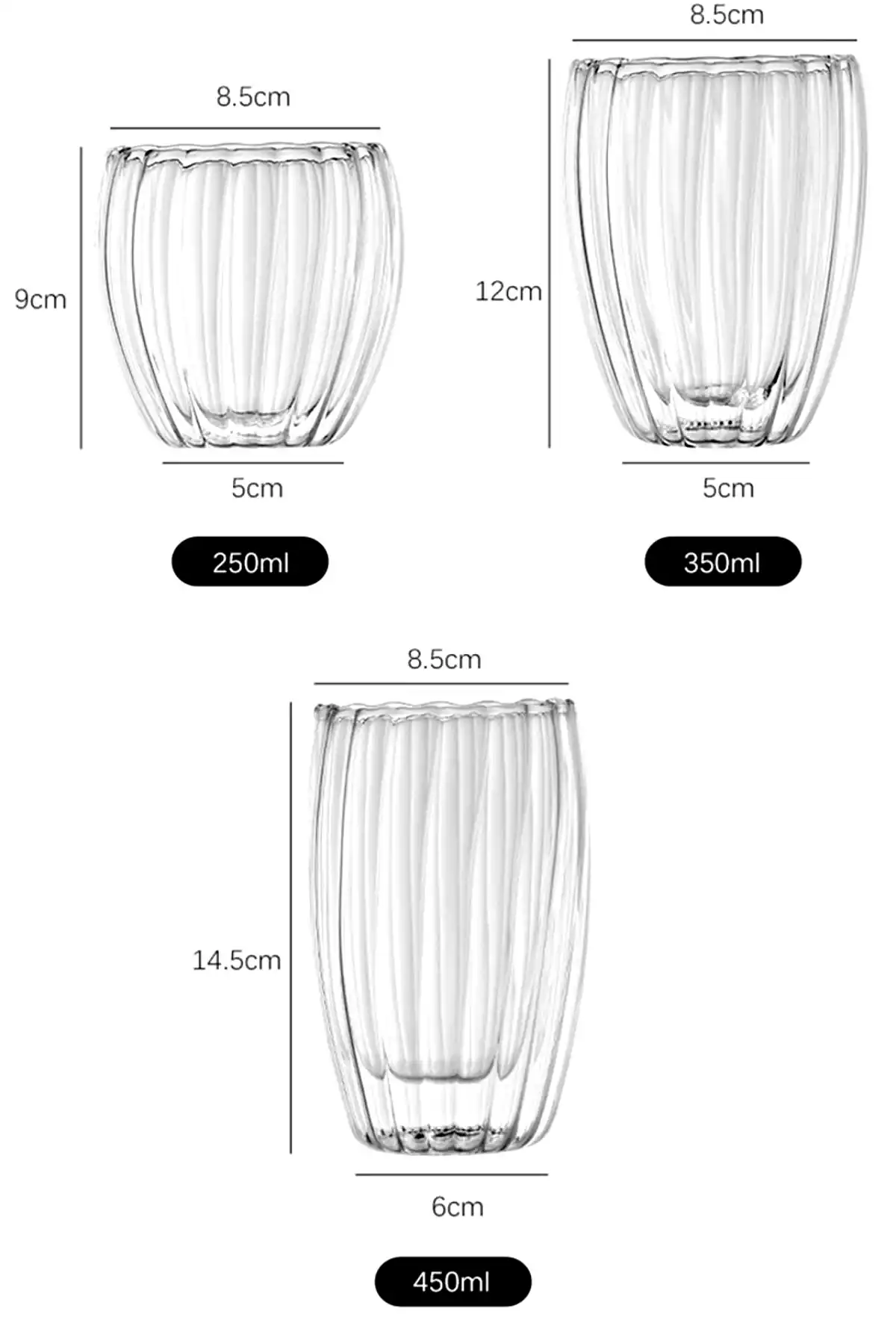 • Tilbe Home 3'lü 450 ml. + 350 ml. + 250 ml. Çift Cidarlı İçten Burgulu Kristal Cam Bardak Çay Süt Kahve Kupası Sıcak & Soğuk İçecek Bardağı Isıya Dayanıklı Borosilikat Sunum Bardak Seti