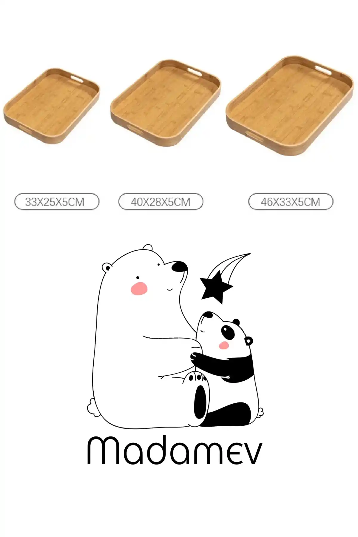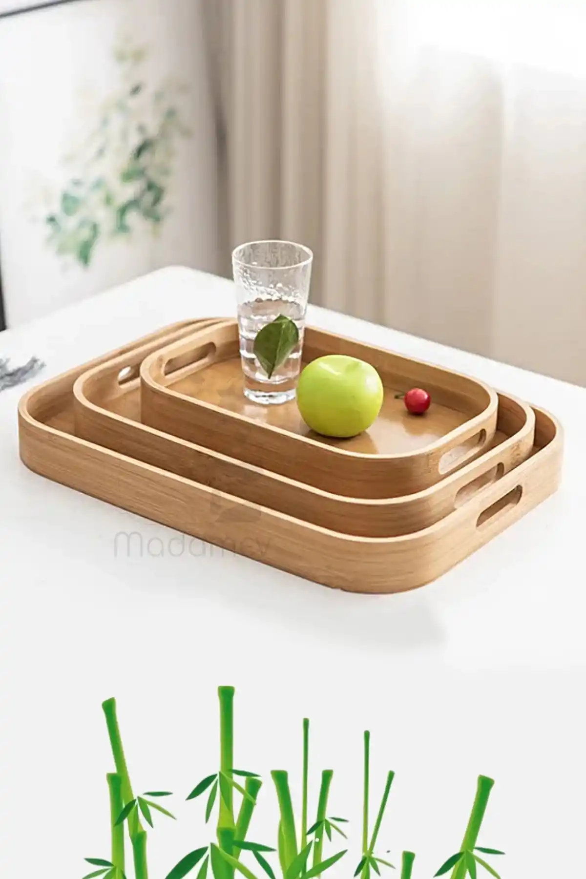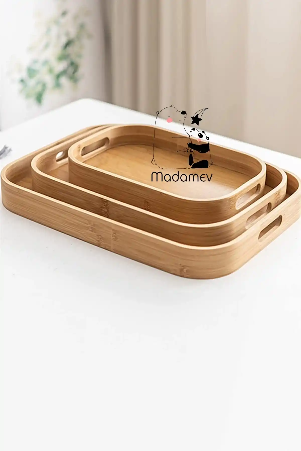 Madamev Doğrulanmış Marka 3'lü Lüx Bambu Tepsi Seti Çay Tepsisi, Sunum Tepsisi, Kahve Sunum Tepsisi Oval Köşe Yemek Tepsi