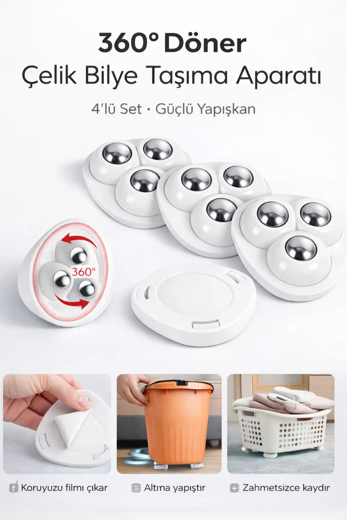 Tilbe Home Doğrulanmış Marka 4 Adet 360 Derece Döner Çelik Bilye Tekerlekli Eşya Yük Taşıma Yapışkanlı Eşya Kaydırma Aparatı Set