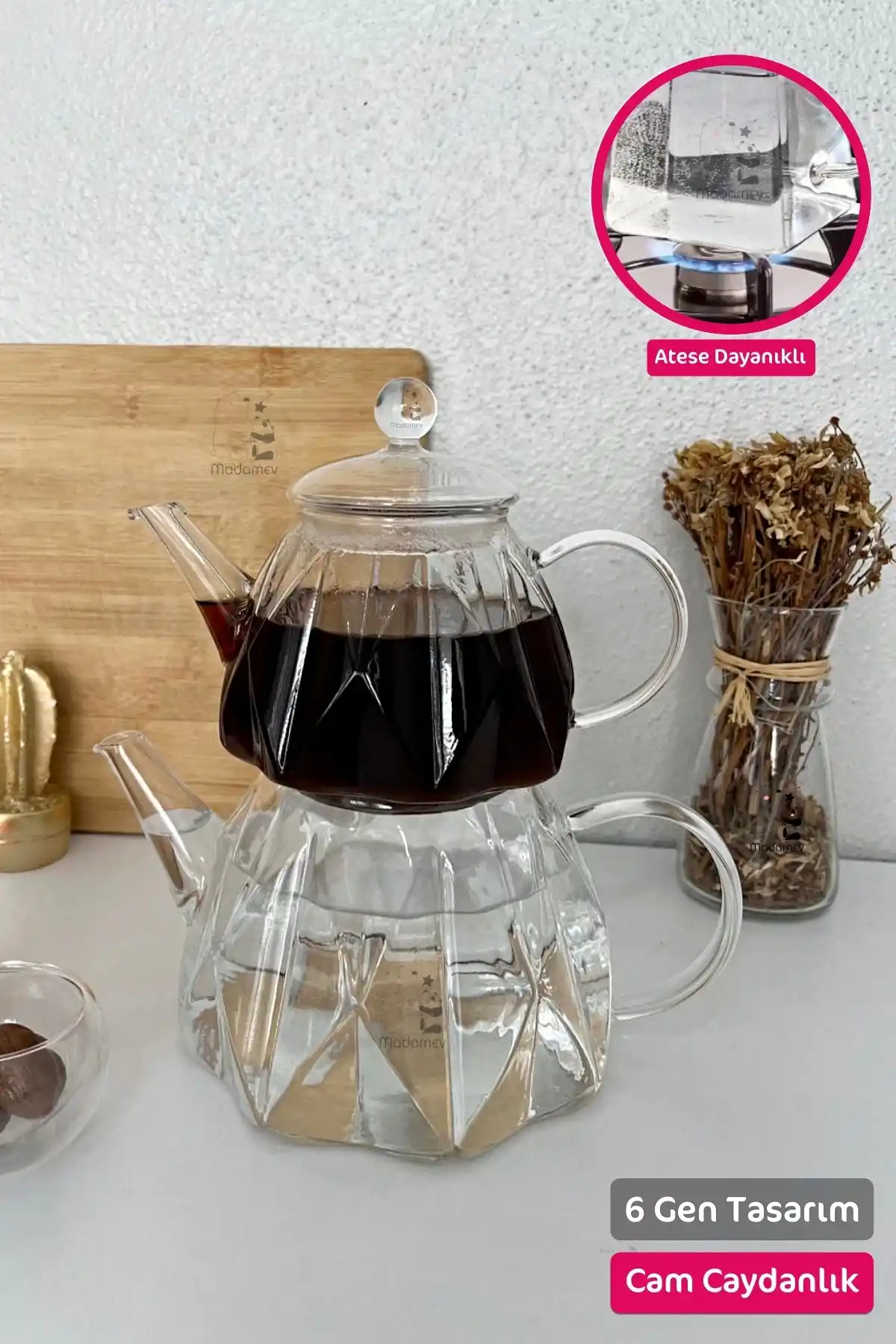 Madamev Doğrulanmış Marka 6 Gen Borasilikat Cam Çaydanlık Takımı Still Tasarım Çelik Filtre Ateşe Dayanıklı Demlik 1450ml.