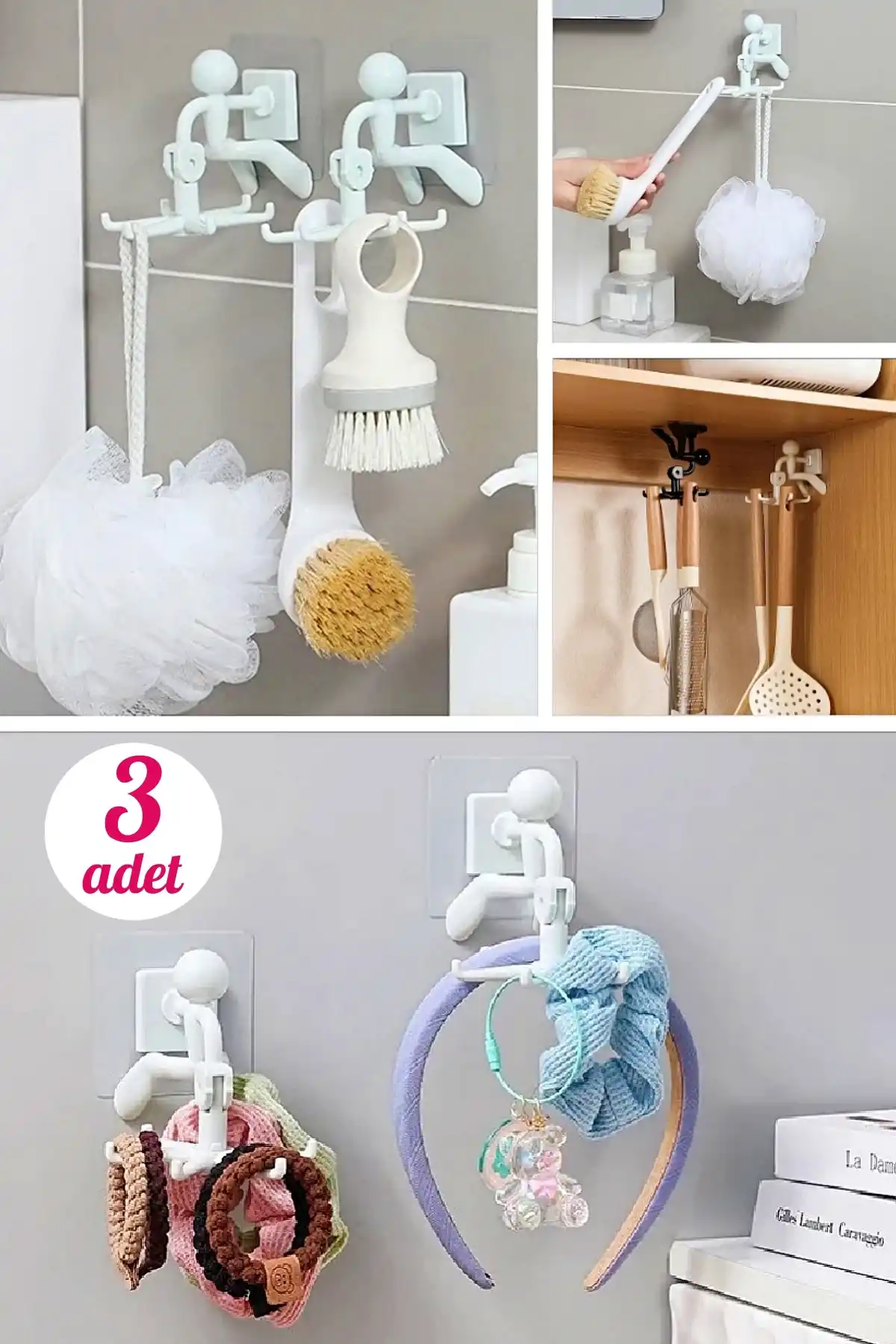 • Tilbe Home 3 Adet 6 Kancalı Mutfak Banyo Rambo Figürlü Döner Başlı Askılık Kepçe Askılığı Yapışkanlı Takı Organizer Askısı Çok Amaçlı Dekoratif Askı Seti