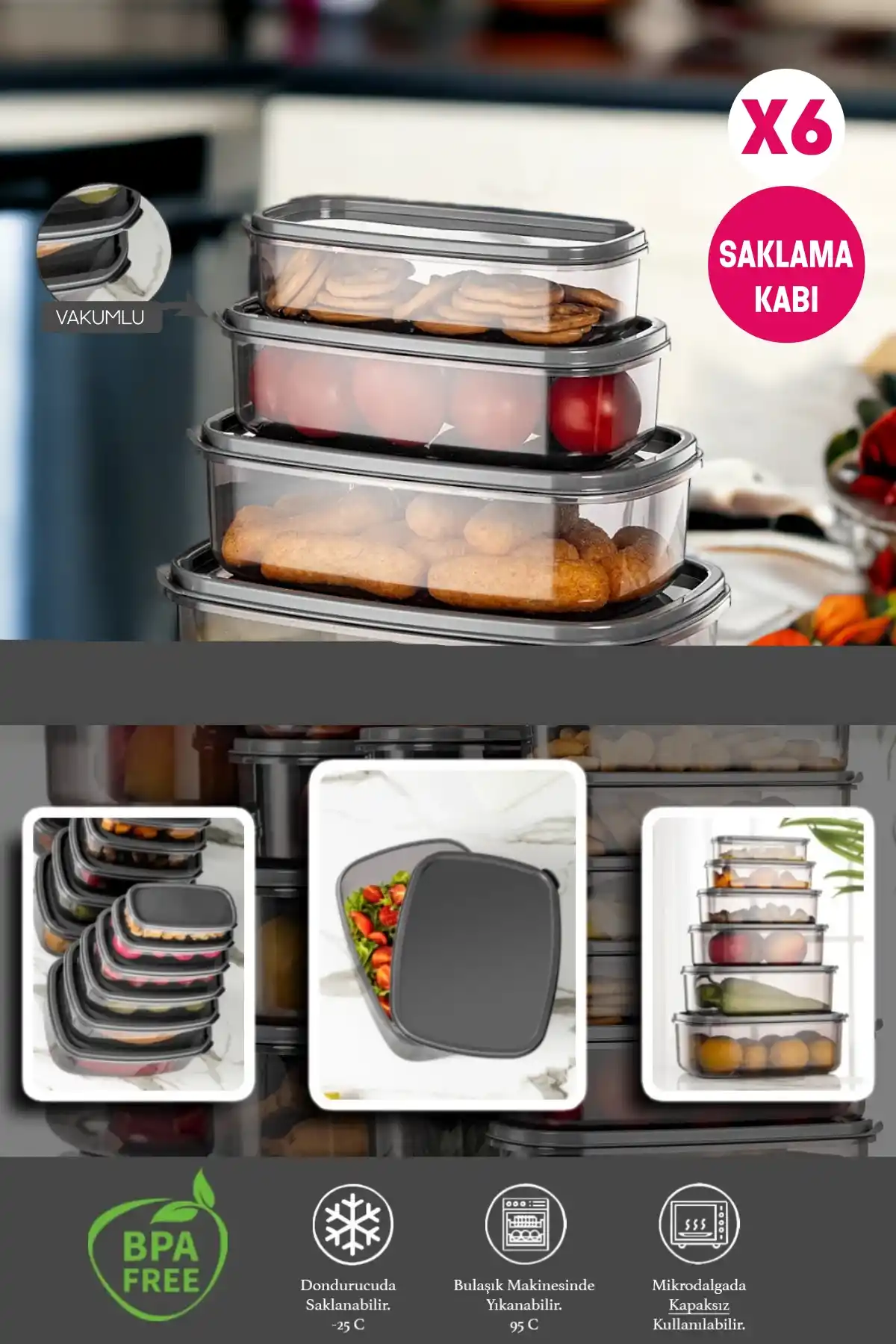 • Paket İçeriği: 300 ml + 500 ml +850 ml + 1350 ml + 2000 ml + 3150 ml Hava Geçirmez Saklama Kabı Seti Bulunmaktadır.