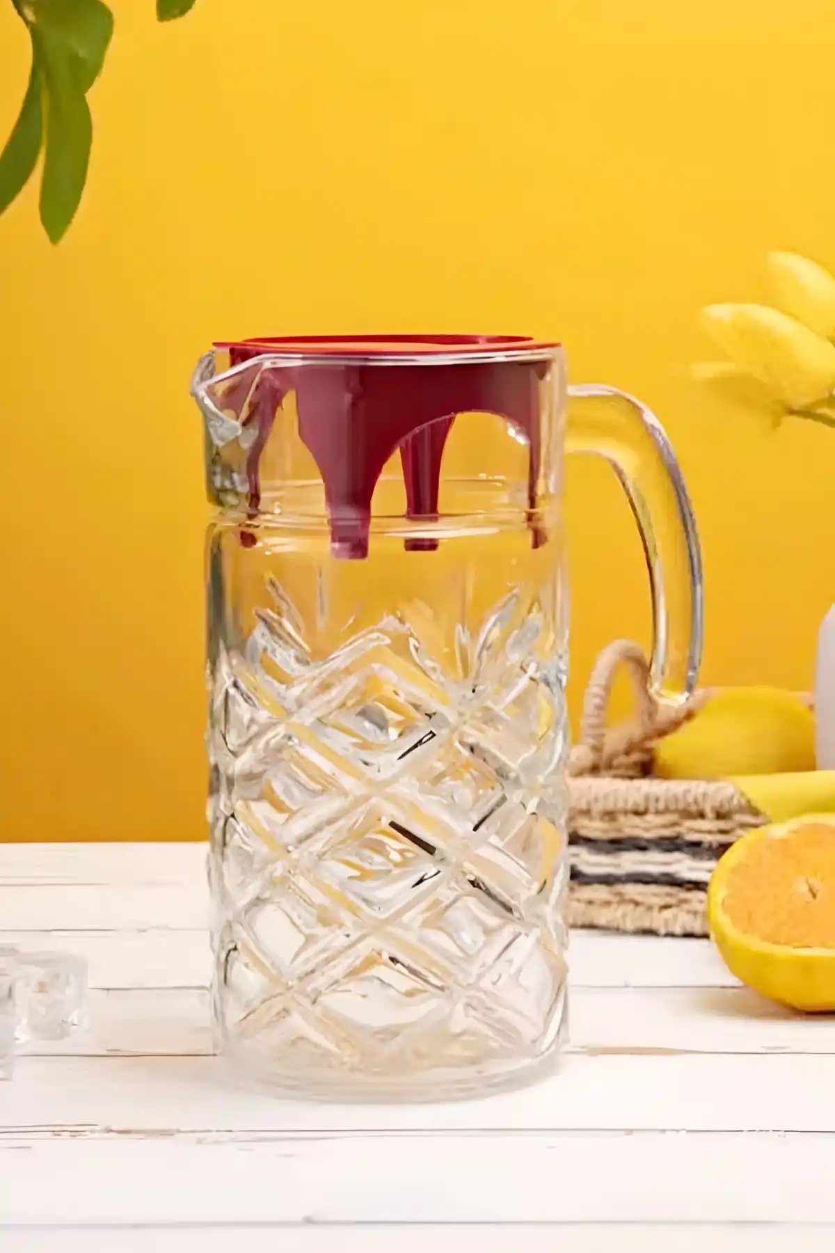 • Tilbe Home Ada Kristal Cam Sürahi Kapaklı Gravürlü 1300 ml. Extra Dayanıklı Cam Kulplu Sofra Meşrubat Sürahi