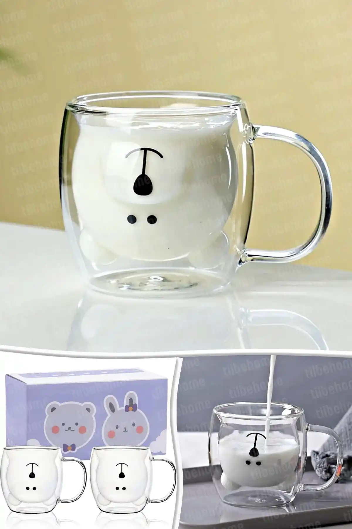 • Madamev Çift Camlı Cidarlı Ayıcık Süt Çay Kahve Su Kupa Bardağı 250 ml. El Yakmaz Isı Yalıtımlı Bardak Sevimli Ayıcık Figürlü Su Meşrubat Bardağı