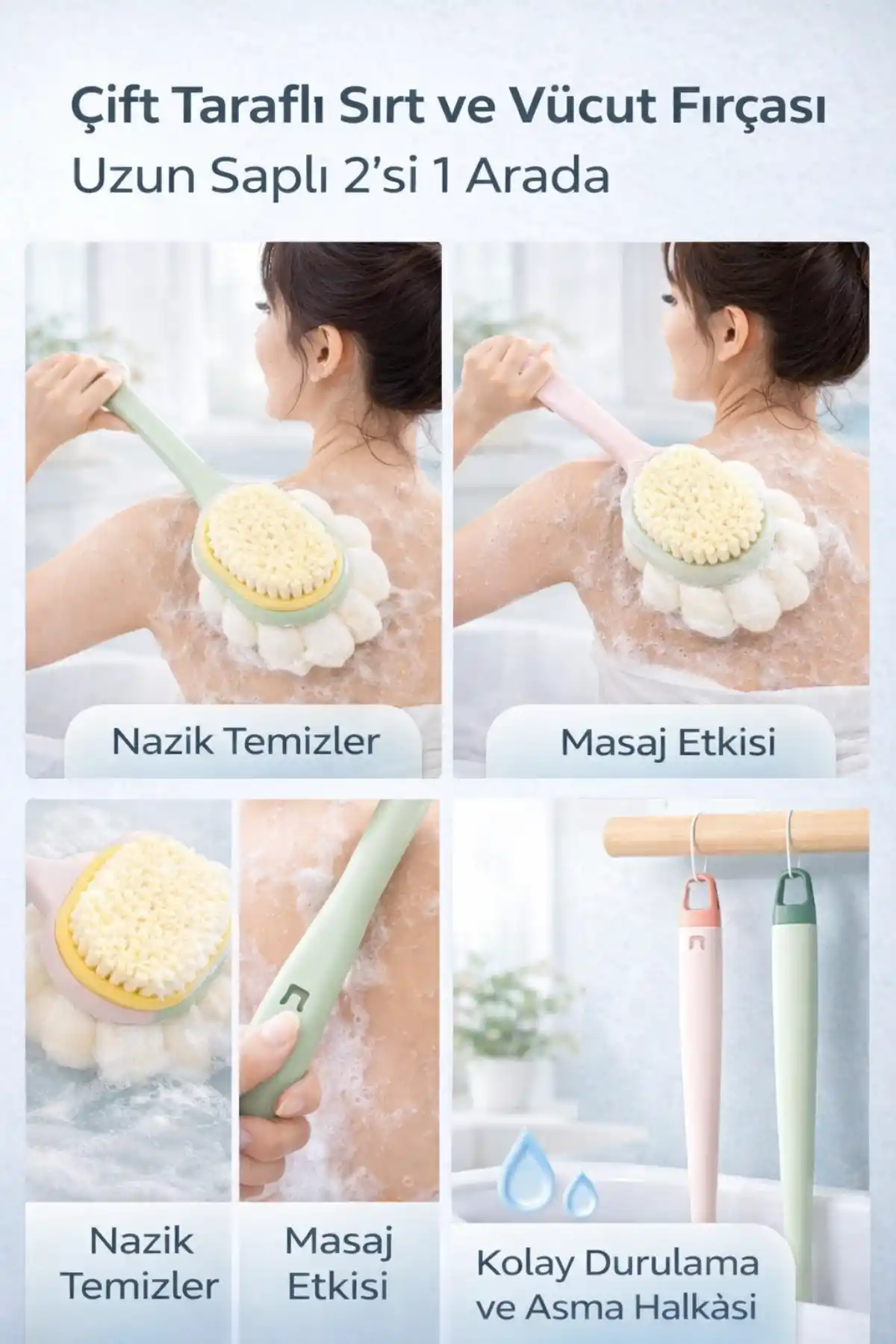 • Çift Taraflı Uzun Saplı Banyo Sırt Fırçası – 2’si 1 Arada Temizlik Deneyimi