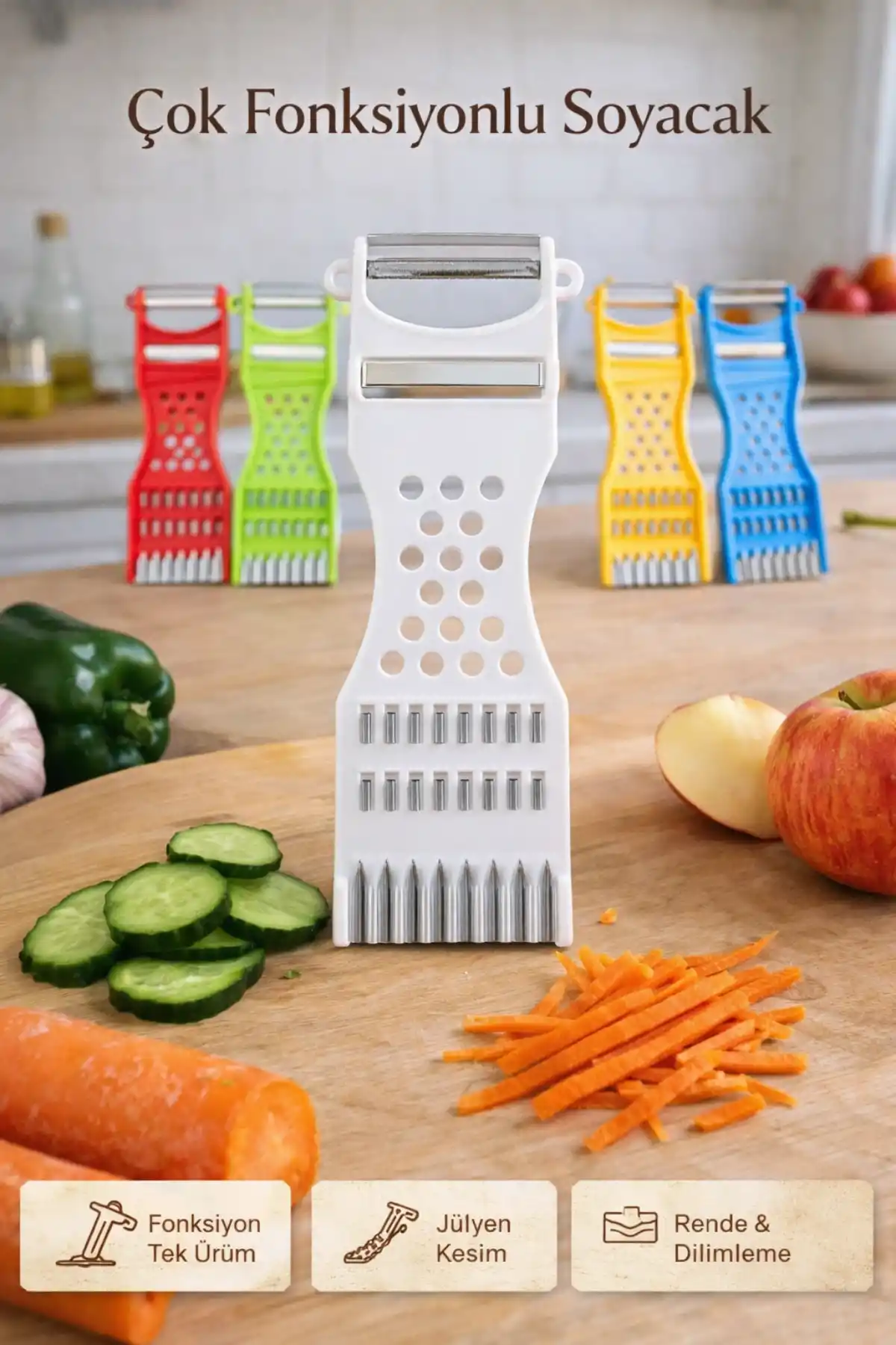 • Çok fonksiyonlu soyacak, jülyen kesici, el rendesi, meyve soyacak, sebze dilimleyici, 6 kademeli rende, patates soyucu, salatalık dilimleme aparatı, havuç jülyen kesici, mutfak soyma aparatı.