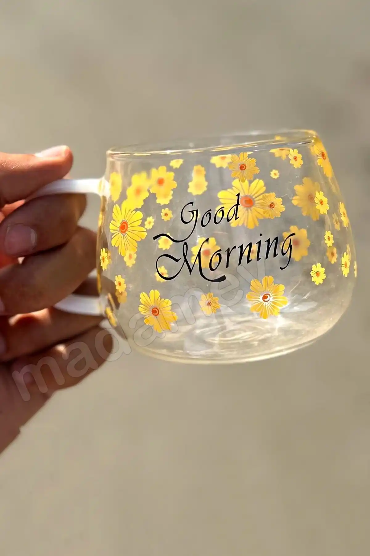 Madamev Doğrulanmış Marka Good Morning Çiçekli Kupa Cam Bardak Isıya Dayanıklı Kulplu Kahve Sunum Kahvaltı Süt Bardağı