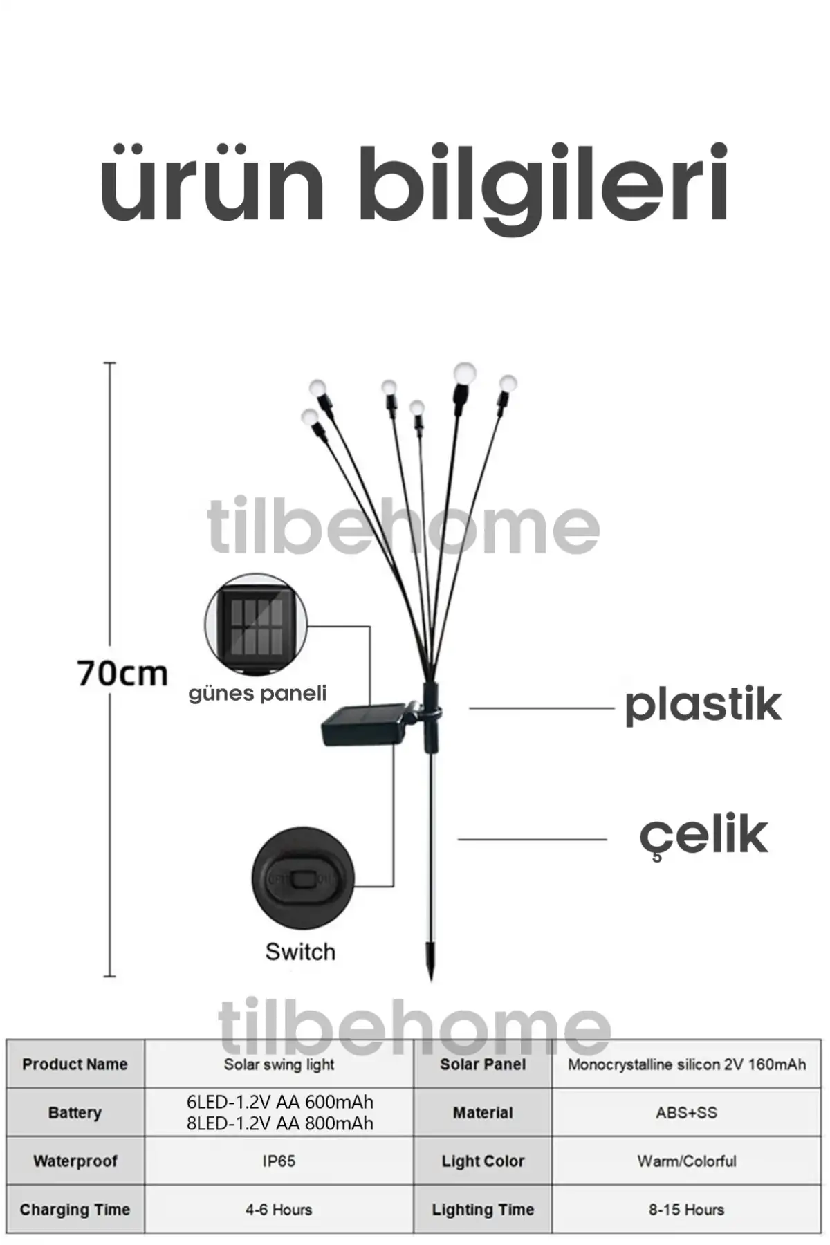 • Yüksek verimli güneş paneli: Güneş paneli ve abajur, yüksek kaliteli su geçirmez IP65 malzemeden yapılmıştır. Aşırı hava koşullarına dayanacak şekilde özel olarak tasarlanmıştır. Dahili 1,2V/600mAh Ni-MH AA pil. Güneş feneri tamamen şarj edildikten sonra 8-15 saat çalışabilir.