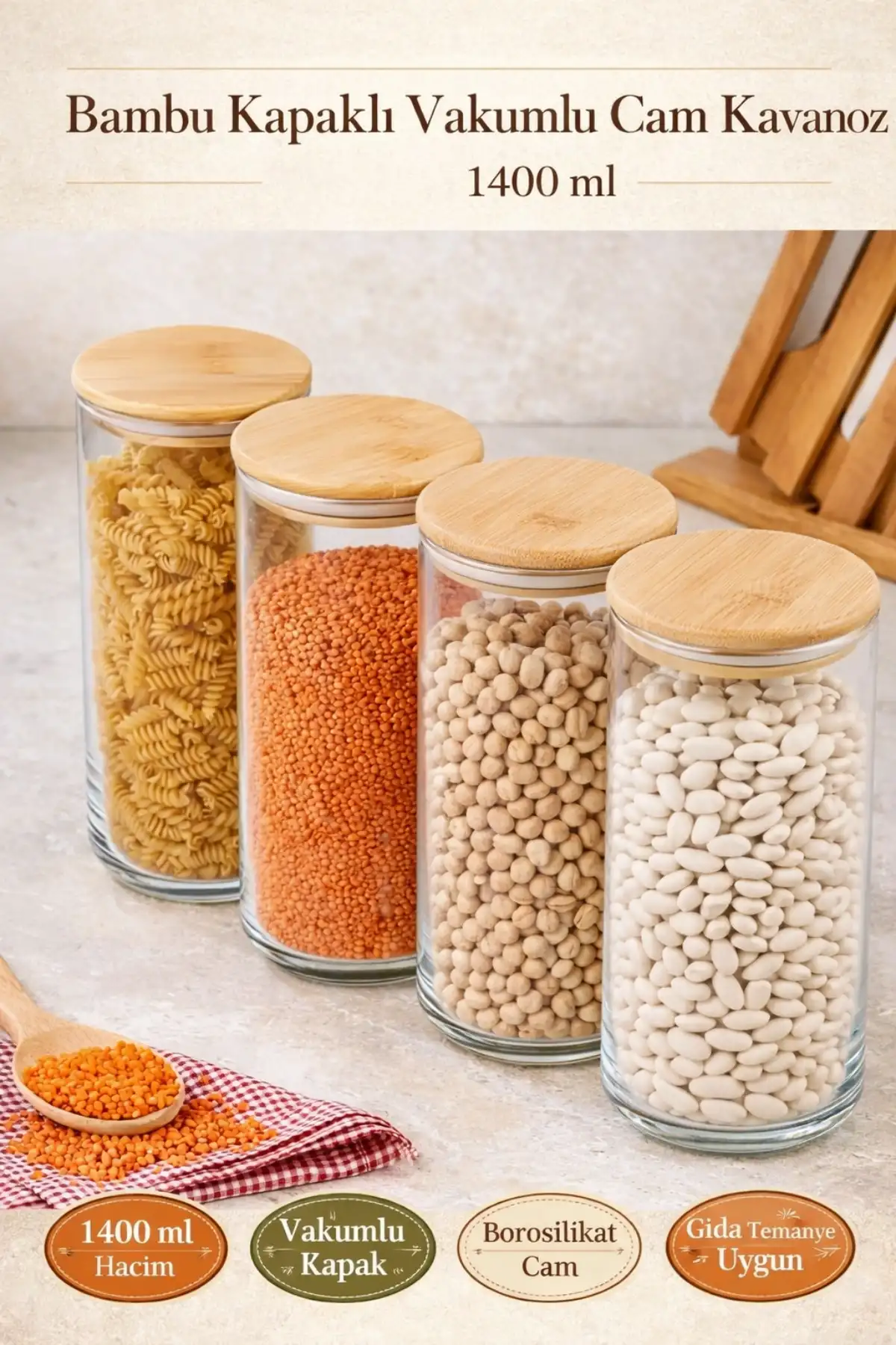 • Tilbe Home 6 Adet Bambu Kapaklı Vakumlu Cam Kavanoz 1400ml Baharatlık Bakliyat Gıda Saklama Kabı Organizer