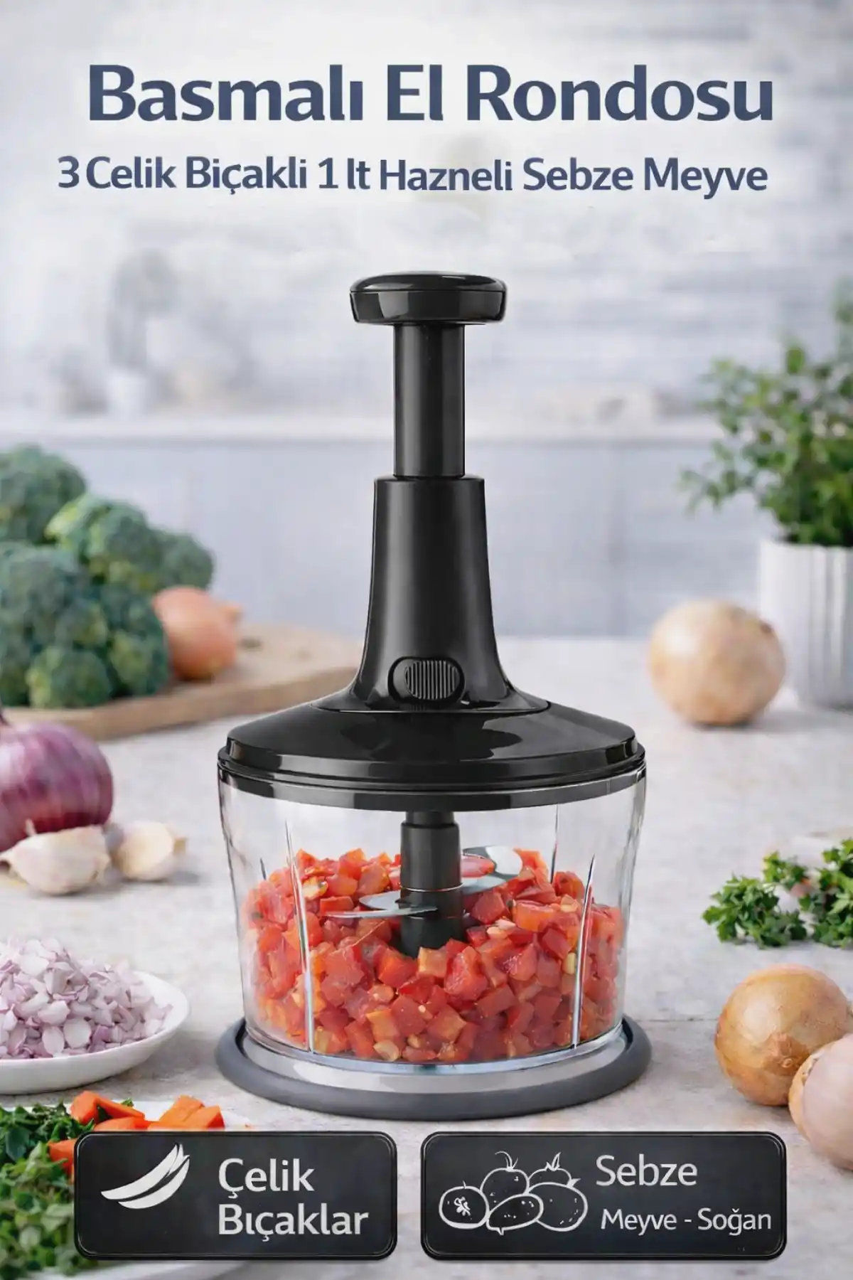 Tilbe Home Doğrulanmış Marka Pratik Basmalı El Rondosu 3 Çelik Bıçaklı Hazneli Sebze Meyve Soğan Doğrayıcı Mutfak El Robotu