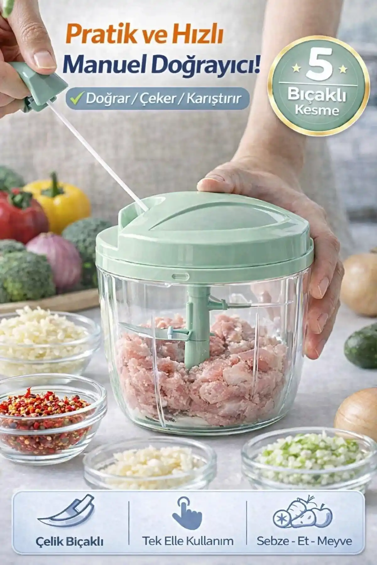 • El Rondosu Çelik 5 Bıçaklı Büyük Boy Sebze Meyve Soğan Doğrayıcı 1000 ml.