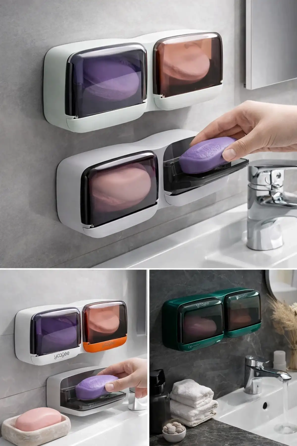 • 2 Li Yapışkanlı Modern Sabunluk Şeffaf Kapaklı Kendinden Boşaltmalı Su Tutmaz Katı Sabunluk