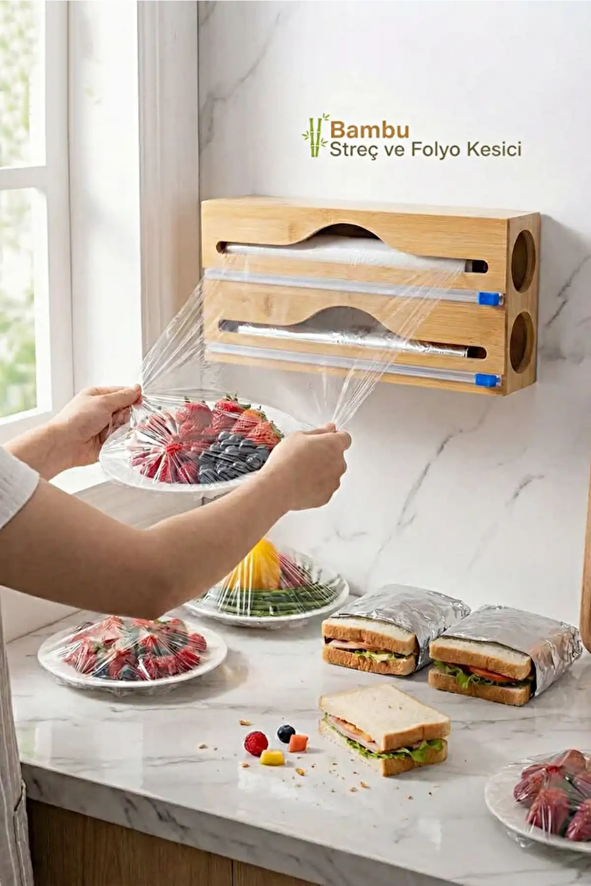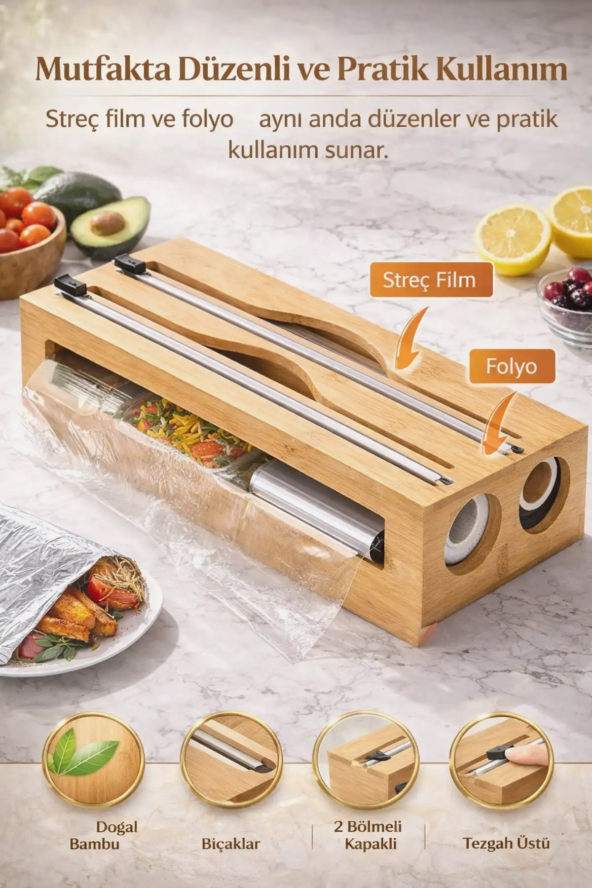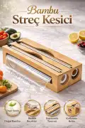 • Mutfakta streç film ve alüminyum folyoyu düzenli, güvenli ve pratik şekilde kullanmak isteyenler için tasarlanmış bambu streç kesici kutu, hem şıklık hem işlevsellik sunar. Doğal bambu gövdesi sayesinde mutfağınıza estetik bir görünüm kazandırırken, keskin ve güvenli bıçakları ile tek hareketle düzgün kesim sağlar.